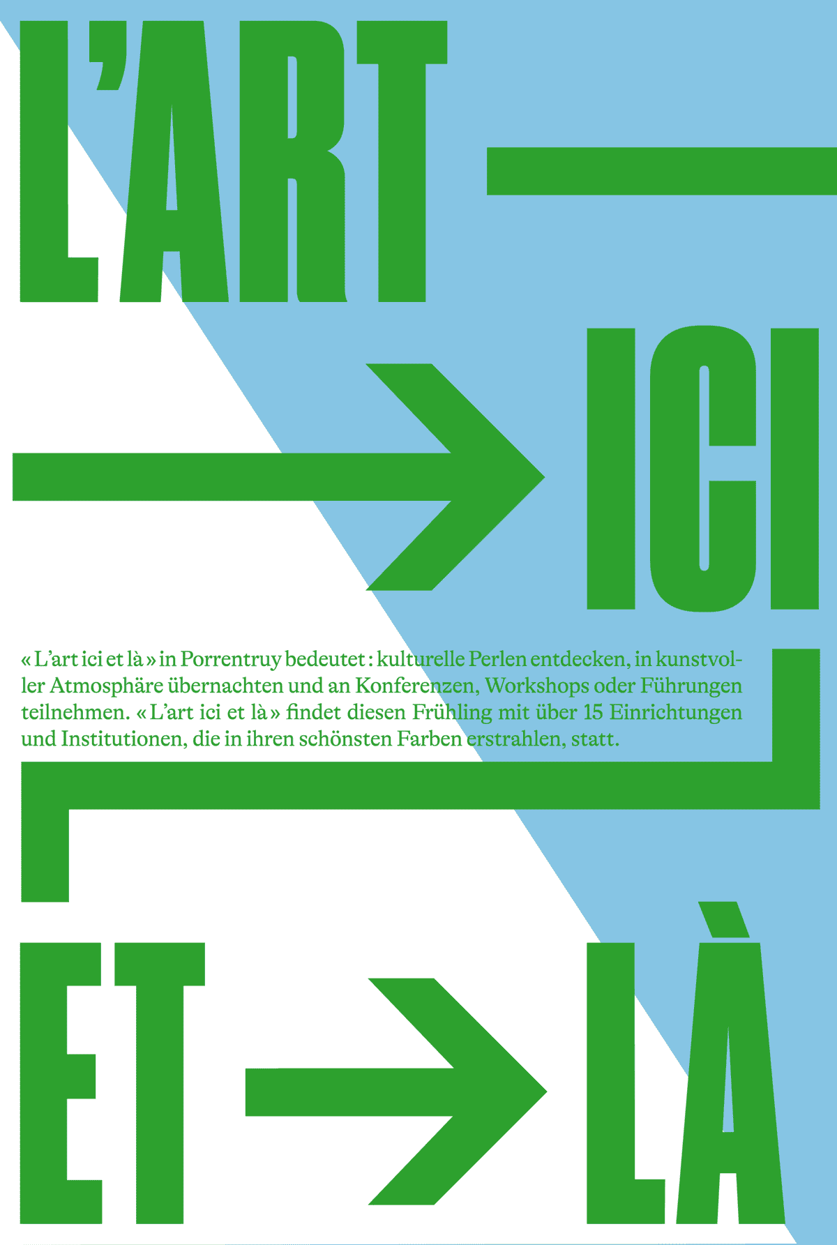 Hier ein Hotel, dort ein Künstler. Dort ein Museum, hier eine Ferienwohnung. Die Kunst von hier, das ist sowohl Haute Couture wie auch Grafik. Die Kunst von dort, das ist ein Museum, eine Galerie, eine Ausstellung. «L’art ici et là» in Porrentruy bedeutet: kulturelle Perlen entdecken, in kunstvoller Atmosphäre übernachten und an Konferenzen, Workshops oder Führungen teilnehmen. «L’art ici et là» findet diesen Frühling mit über 15 Einrichtungen und Institutionen, die in ihren schönsten Farben erstrahlen, statt.